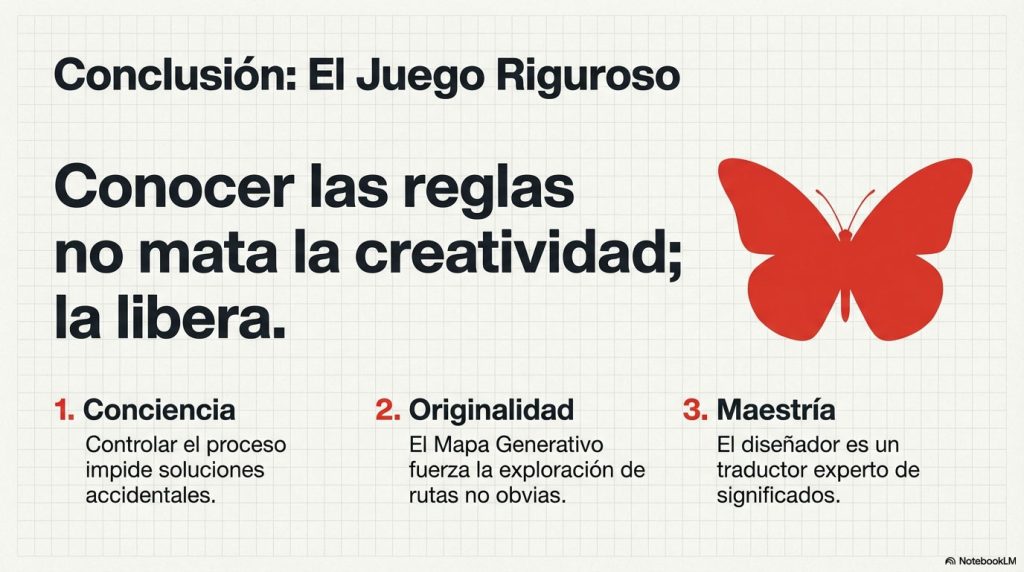 El modelo de Román Esqueda propone una transformación fundamental para la disciplina: el paso de una práctica de diseño intuitiva, subjetiva y a menudo inexplicable, a una profesión consciente, fundamentada y enseñable. Al situar el lenguaje como el origen y fin de todo proyecto, ofrece un sistema lógico para la creatividad. Este informe llama a los diseñadores y consultores a estudiar y aplicar estas «reglas del juego» no como limitaciones que coartan la expresión, sino como poderosas herramientas de empoderamiento. Dominar la sinécdoque, la metonimia y la metáfora permite potenciar la creatividad con intención, fortalecer el rigor profesional y, en definitiva, incrementar de forma sustancial el valor estratégico que el diseño aporta en el mercado.