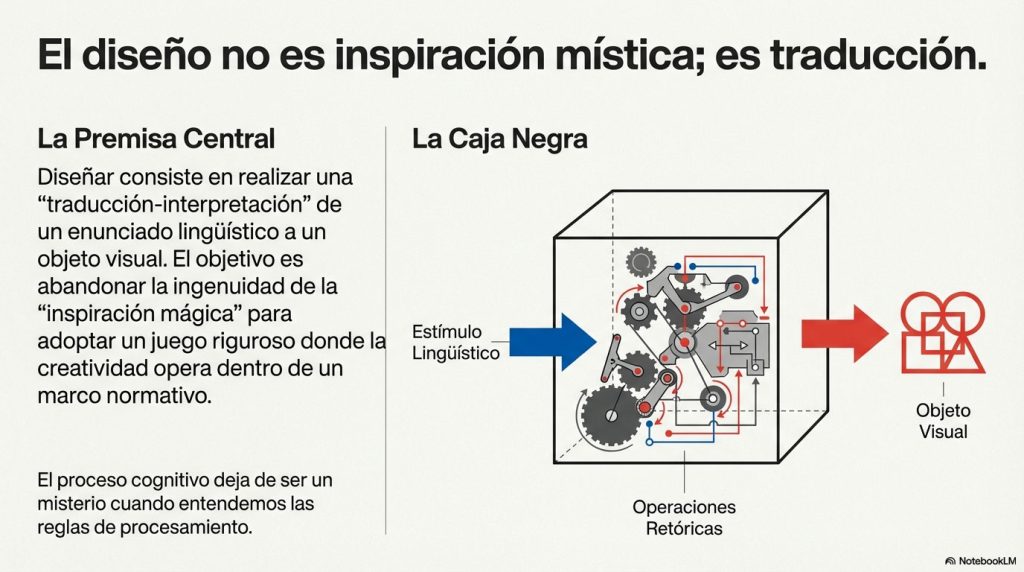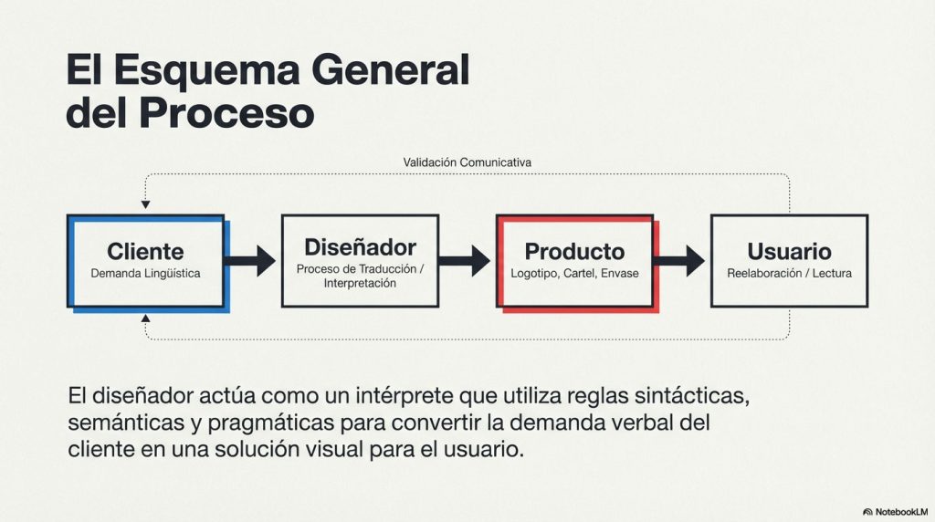 La tarea del diseñador, por tanto, no es la de un creador de formas en el vacío, sino la de un intérprete que realiza una «traducción intersemiótica»: vierte el significado de un enunciado lingüístico a un enunciado gráfico. Este enfoque tiene una consecuencia fundamental, pues hace del diseño un arte «explicable, repetible y, por lo tanto, enseñable». Al basarse en la interpretación de un lenguaje compartido, el proceso deja de ser un misterio subjetivo para convertirse en una disciplina con una lógica interna que puede ser analizada, optimizada y dominada.