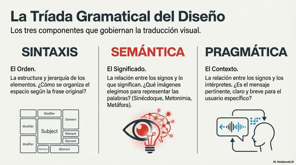 Para aplicar el modelo de Esqueda de manera efectiva, es crucial comprender su estructura fundamental, la cual toma prestada de la gramática y la semiótica. Si el diseño es un juego del lenguaje, entonces, como todo lenguaje, posee una gramática que organiza su funcionamiento. Esta sección desglosa los componentes de dicha gramática —sintaxis, semántica y pragmática— como los pilares sobre los que se construyen todas las interpretaciones gráficas.