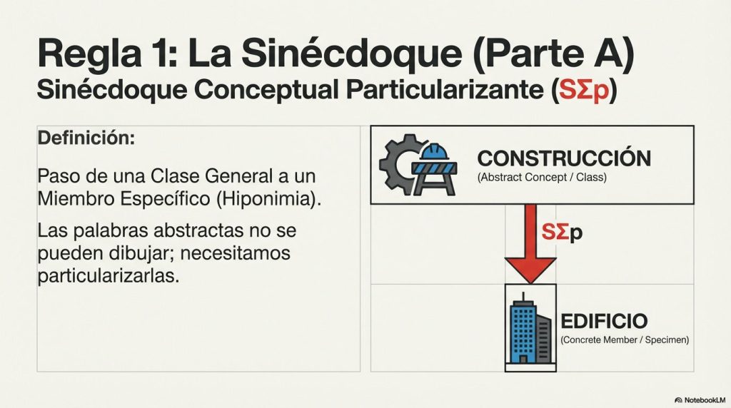 1. Sinécdoque Conceptual Particularizante (SΣp): El diseñador parte de una palabra de contenido abstracto o general (el todo conceptual), como «construcción», y la concreta seleccionando intuitivamente un hipónimo, es decir, un tipo específico que pertenece a esa categoría. Por ejemplo, dentro de «construcción» elige «edificio». Este primer paso transforma un concepto general en uno particular.